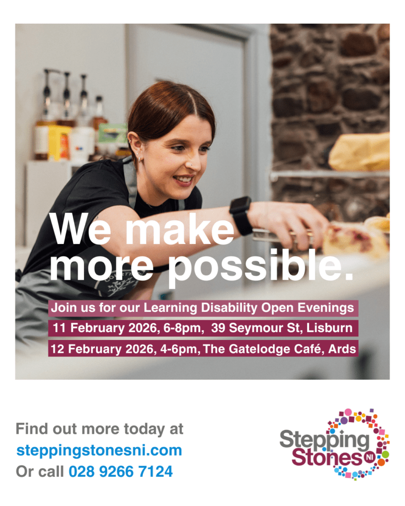 Stepping Stones NI is inviting parents, carers and individuals with learning disabilities to see for themselves how the organisation makes more possible. Learning Disability Open Evenings will take place on Wednesday 11 February 2026, from 6–8pm at Stepping Stones NI’s headquarters, 39 Seymour Street, Lisburn, and on Thursday 12 February 2026, from 4–6pm at The Gatelodge Café, Newtownards.